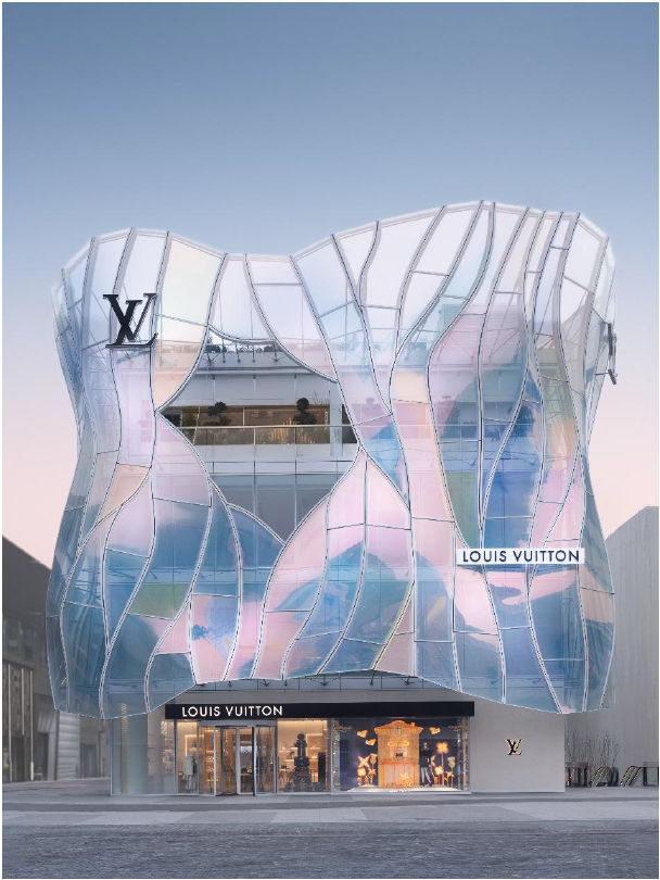 在北京三里屯太古里,刚刚启幕的路易威登之家以其独特的立面设计成为这一季的视觉焦点。建筑从中国传统的太湖石与2016春夏女装秀的一款经典连衣裙中汲取灵感,让坚硬的建筑材质展现出织物般的流动感。精工玻璃幕墙呈现出非几何的“建筑蕾丝”形态,既呼应了太湖石天然的孔洞纹理,又重现了时装的精妙结构。双层玻璃面板在日光的折射下,如同超现实的万花筒,随天气与季节流转出不同的光影气象,实现了建筑空间与时尚美学的微妙共振。