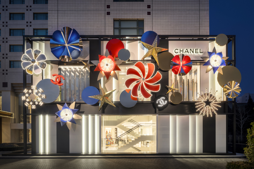 视线转向北京与上海的半岛精品店,香奈儿将节日氛围延续至外墙与橱窗。不同于宏大的建筑叙事,这里更像是一个精致的梦境剧场。星星、珍珠、旋转风车与经典的双C标志,在红、银、金的基调下交错呈现。璀璨的星空图案致敬了嘉柏丽尔·香奈儿位于La Pausa别墅的金色床头,而红金螺旋造型则让人联想到康朋街31号的Art Deco镜梯。琉璃珠饰的通透质感与闪亮装饰相映成趣,以一种轻盈且充满童趣的方式,重新演绎了品牌经典的风格符号。